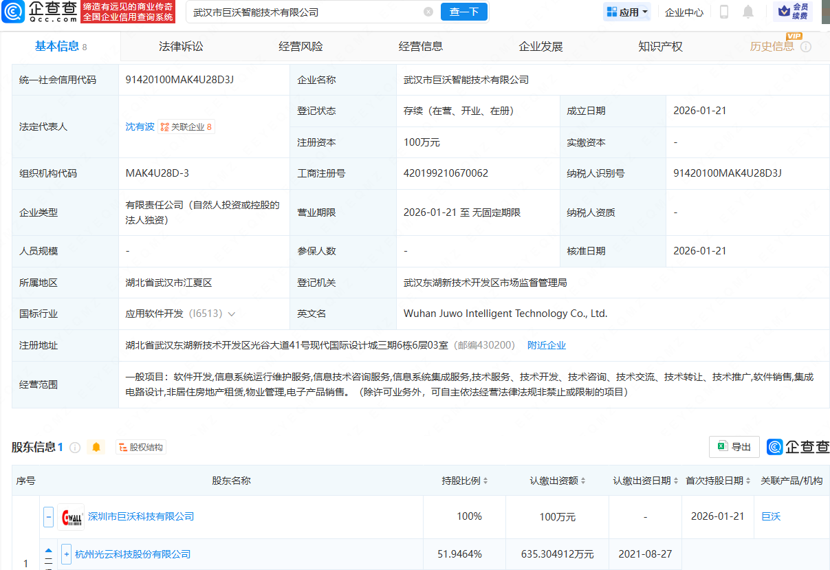 近日,武汉市巨沃智能技术有限公司成立,法定代表人为沈有波,经营范围包含:软件开发;信息系统运行维护服务;信息系统集成服务;集成电路设计;电子产品销售等。企查查股权穿透显示,该公司由光云科技(688365)旗下深圳市巨沃科技有限公司全资持股。